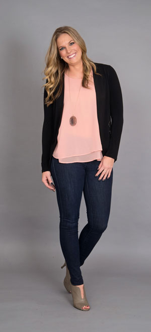 BCBG blazer; Blu Pepper blouse; Banana Republic jeans; Nine West shoes