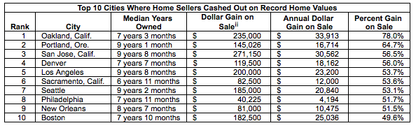 In Boston, people who owned their homes for a median of seven years and 10 months showed an average total dollar gain on the sale of $182,500, an average annual dollar gain on sale of $25,063 and a percent gain on sale of 49.6 percent. That’s far above the average numbers in the United States, where owners who sold after seven years and five months saw a dollar gain on sale of $39,900, an annual dollar gain on sale of $5,404 and a percent gain on sale of 24.1 percent.