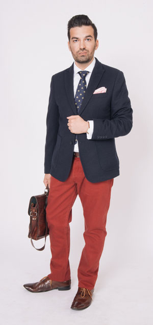 Please list the designer (or store) of each piece of clothing that you wore today, including accessories and shoes. Jacket: Without Prejudice, London; shirt and pocket square: T.M. Lewin, London; trousers: Paul Smith; shoes: Gucinari; vintage watch: Sekonda; bag: Vida Vida leather.