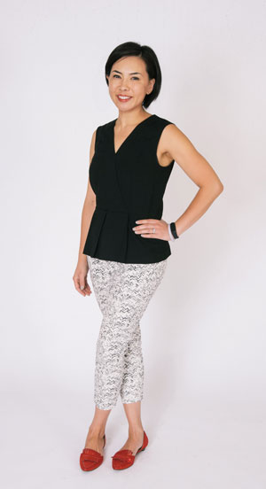 My look reflects my “business comfortable” or “fun professional” approach. I like clean lines and mixing causal pieces, such as dark wash, well-tailored jeans or capri pants with more traditional, professional pieces, such as blazers or classic cardigans. My one “must” is comfortable shoes. As a Boston-based real estate professional, I walk a lot! However, comfortable doesn’t have to mean boring! My red sparkle Oxford-style flats can go for miles. I’m a professional, but I’m also a real person who needs to be able to work — and walk — in the clothing that I am wearing!