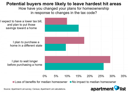 In counties that are negatively impacted, 18 percent of potential buyers report that they now plan on buying a home in a different state — which is double the percentage of homebuyers in other counties who plan on buying out-of-state due to the tax code.