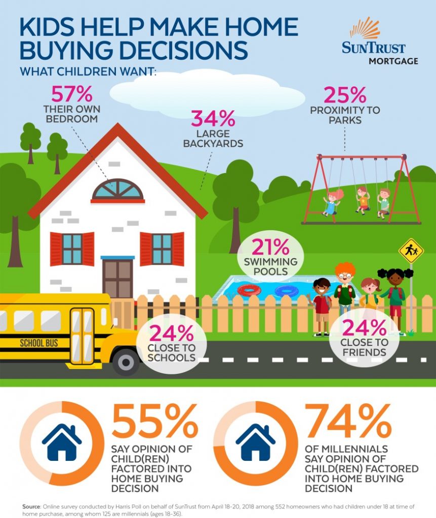 Numerous factors like price and location come into consideration when buying a home. A new Harris Poll survey by SunTrust Mortgage found that 55 percent of homeowners with a child under the age of 18 said their child’s opinion was a factor when purchasing their home.
