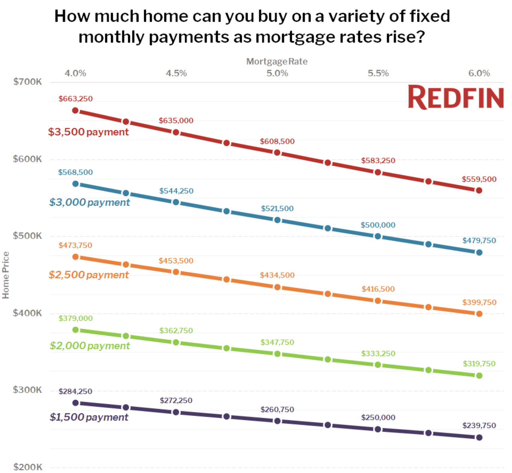 Of course, there are dozens more factors that determine how much a mortgage borrower will need to set aside to purchase a home at a given price point. That’s not to mention the positive or negative effects that come from rising incomes, changes in the housing market and more. But Redfin used the data to argue why recent, seemingly small interest rate hikes may play an outsize role in swaying homebuyers and would-be sellers one way or another.