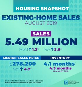 At the same time, home prices are also rising. According to NAR, the median existing home price for all housing types in August was $278,200, a 4.7 percent increase from August 2018. However, higher prices appear to be driven by a lack of supply. Total housing inventory decreased to 1.86 million in August, down from 1.9 million for existing homes in July. “Sales are up, but inventory numbers remain low and are thereby pushing up home prices,” said Yun. “Home builders need to ramp up new housing, as the failure to increase construction will put home prices in danger of increasing at a faster pace than income.”