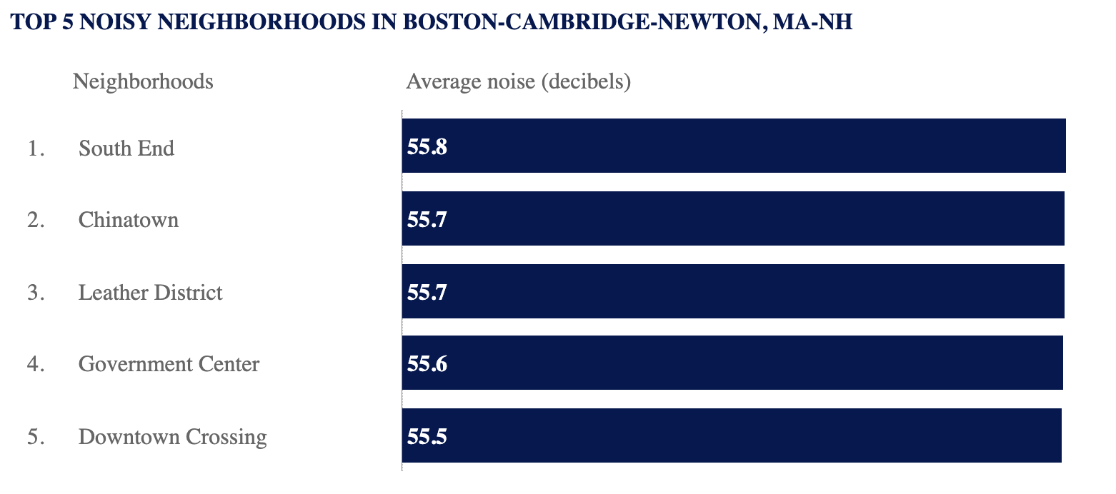 The noisiest neighborhoods in the Boston area are the South End, 55.8; both Chinatown and the Leather District, 55.7; Government Center, 55.6; and Downtown Crossing, 55.5.