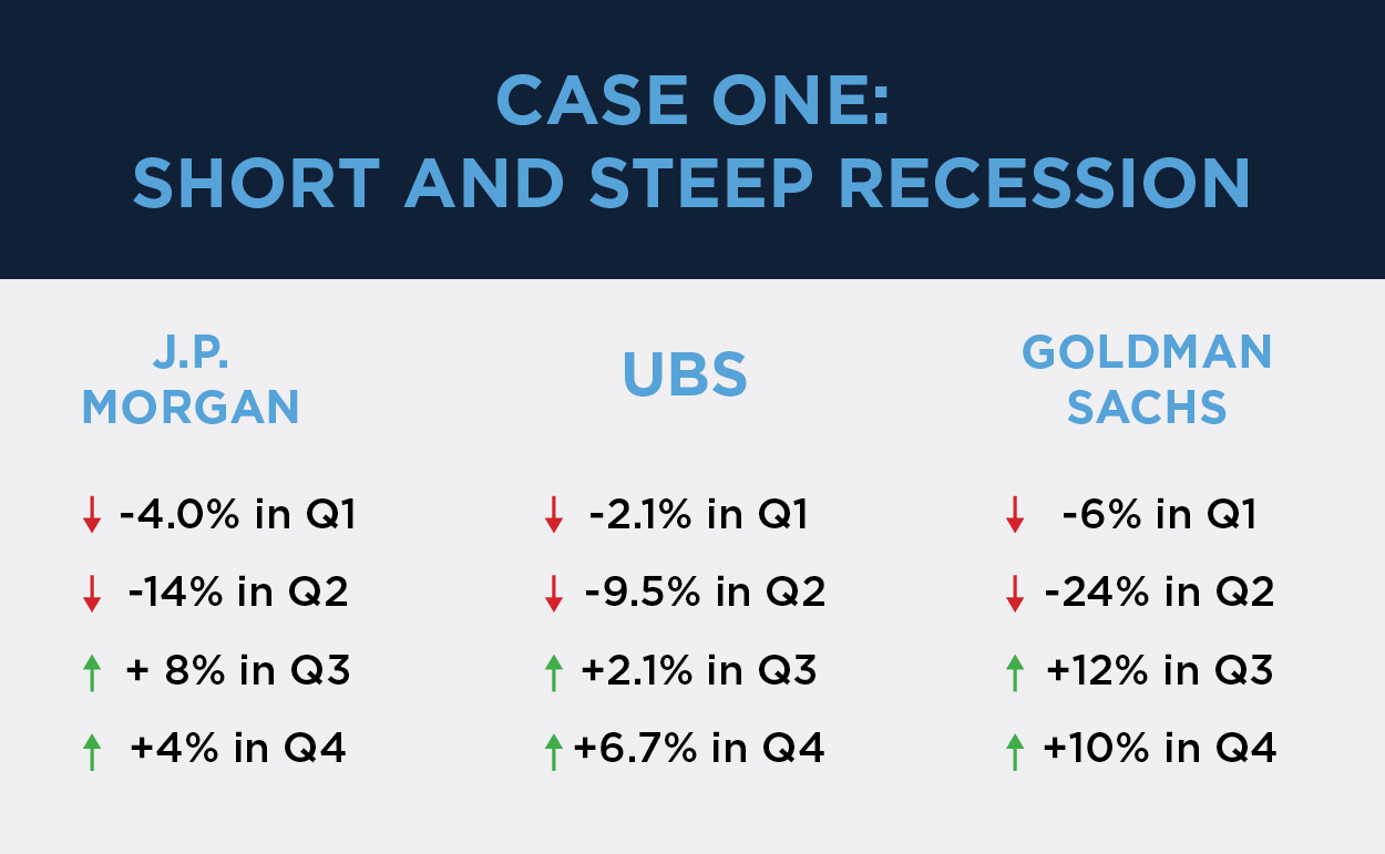 Case 1 involves a short recession with a sharp and steep drop in Q2, with a V-shaped recovery by Q4. It is currently the prevailing theory, with Goldman Sachs, UBS and J.P. Morgan all predicting steep drops of anywhere between 9.5% to 24% in Q2.