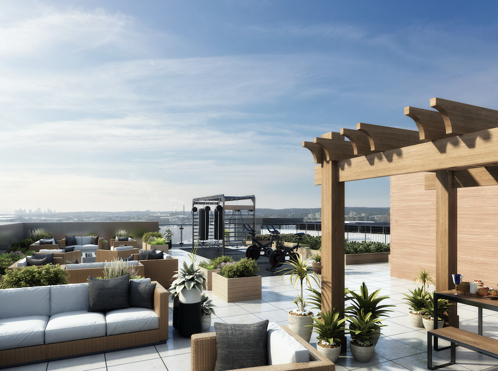 Caldwell includes modern amenities such as a rooftop pool with cabanas, fire pits and sky lounge as well as views of the Boston skyline and the Atlantic Ocean. The building also includes a fitness center with an indoor rock climbing wall, outdoor TRX fitness area and Peloton spin studio.