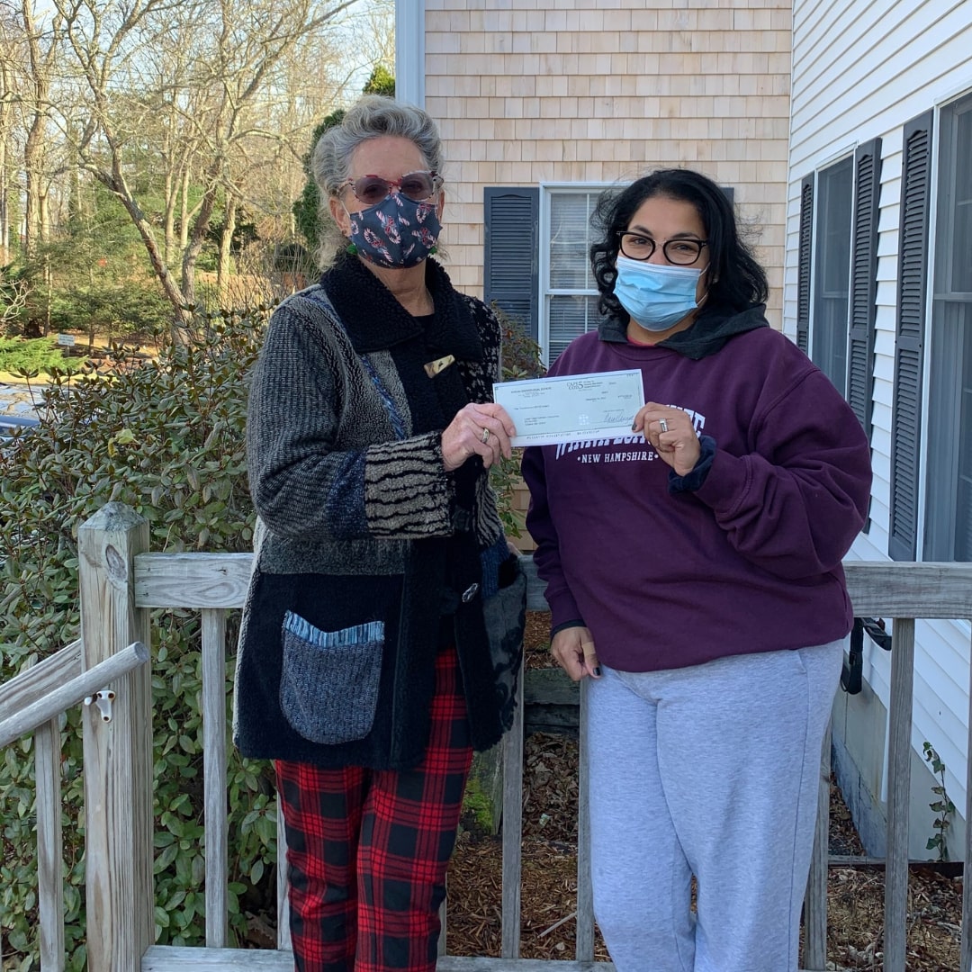 Annie Blatz (left), Broker of Record, Kinlin Grover Real Estate, presents a donation check to Gennie Moran, Chief Operating Officer, Lower Cape Outreach Council.