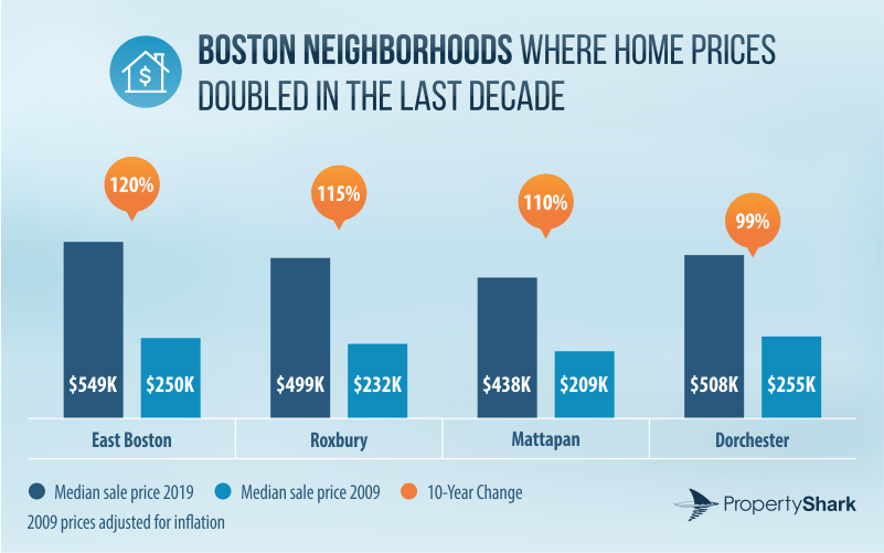 East Boston, Roxbury and Mattapan were identified as hot neighborhoods, where the median more than doubled.