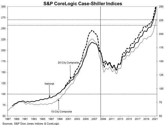 “We have previously suggested that the strength in the U.S. housing market is being driven in part by reaction to the COVID pandemic, as potential buyers move from urban apartments to suburban homes,” Lazzara said. “This demand surge may simply represent an acceleration of purchases that would have occurred anyway over the next several years. Alternatively, there may have been a secular change in locational preferences, leading to a permanent shift in the demand curve for housing.”