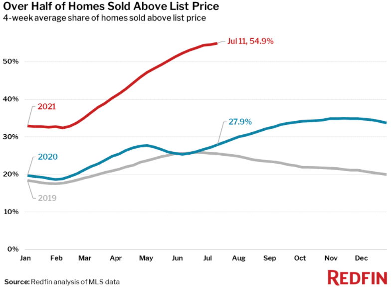 A record 55% of homes sold above list price, which is up from 28% a year earlier, Redfin said. However, this measure appears to be plateauing, as it has been at 54% to 55% since the four-week period ended June 27, Redfin said.
