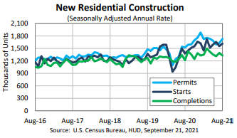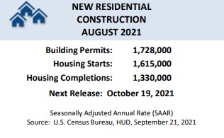 The seasonally adjusted annual rate for privately owned housing units authorized by building permits was at 1,728,000 in August, up 6% from July’s revised rate and up 13.5% from August 2020.