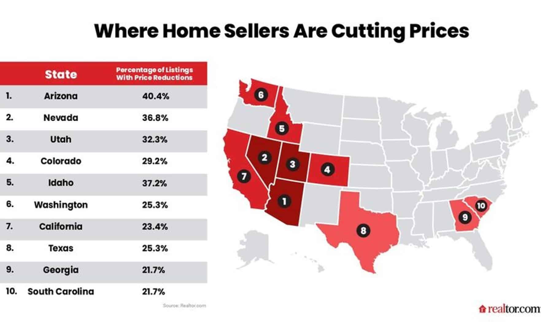 Realtor.com analyzed the percentage of home listings that have undergone price reductions in states across the country. Arizona leads the list, where 40% of listed homes had a price reduction in October 2022. Also on the list are Idaho, Nevada, Utah, Colorado, Washington, Texas, California, South Carolina and Georgia, all of which are experiencing price reductions at higher rates than the U.S. average.