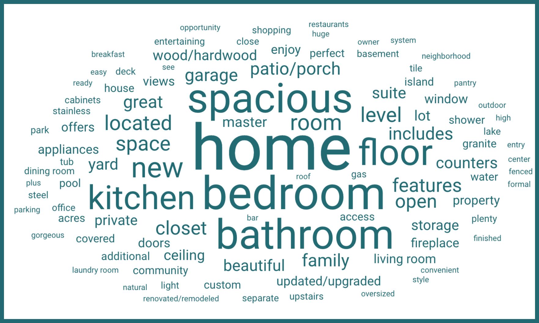 We know that buyers are prioritizing space in this post-pandemic world. And as such, the words “room” and “space” came in at the top of the list, trailing more predictable descriptors like “home,” “bedroom,” “bathroom,” and “kitchen.” Similarly, “spacious,” “open,” and “great” were the most popular adjectives, along with “new.”
