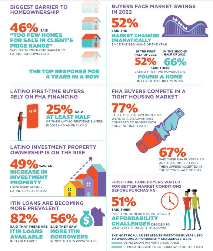 Of course, the roadblocks that existed for Latino homebuyers in 2022 will still present issues in the future. In addition to volatile interest rates and inventory shortages, home prices have inflated in many places with dense Latino populations. In Florida, which is home to over 5.8 million Latinos, prices increased 18% year over year during 2022. The Urban Institute also found that 80% of all available properties across the country were unaffordable to “middle-income families” in 2022.