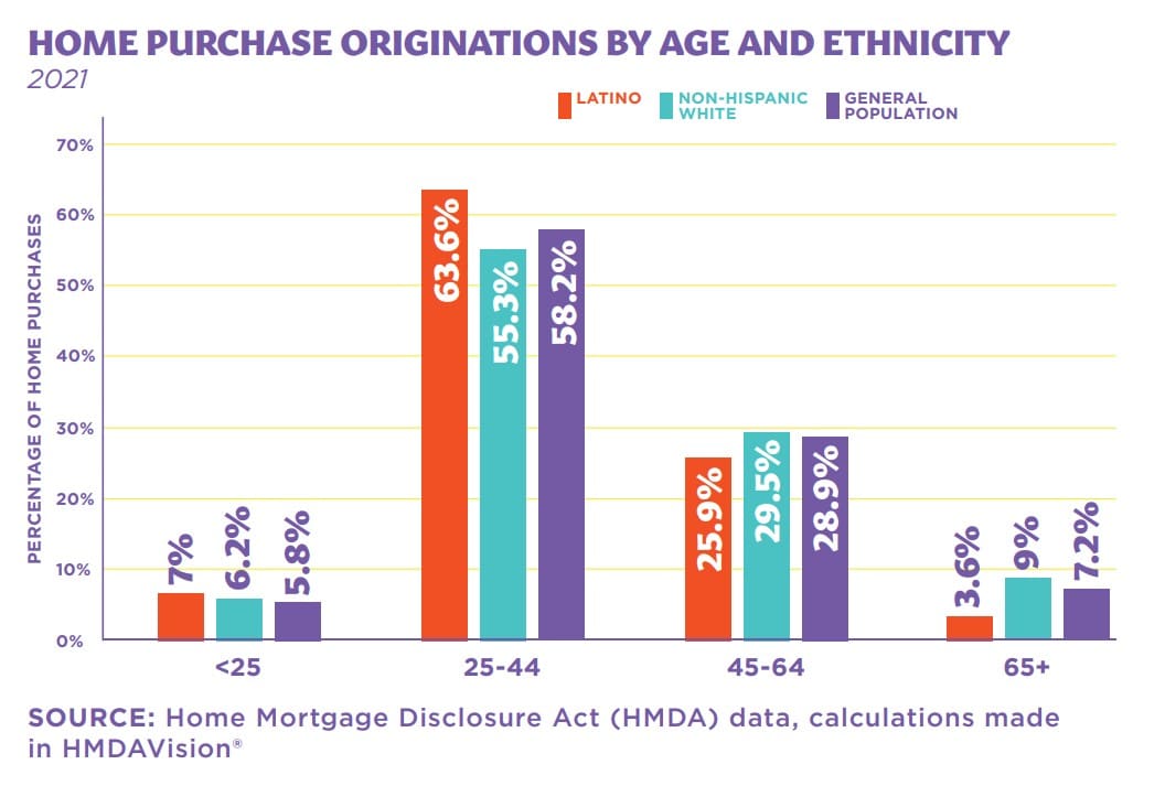 Hispanic and Latino buyers are also younger than the average buyer: 70.6% of Latino homebuyers in 2021 were younger than 45, and Latinos also represent the highest share of homeowners under age 25.