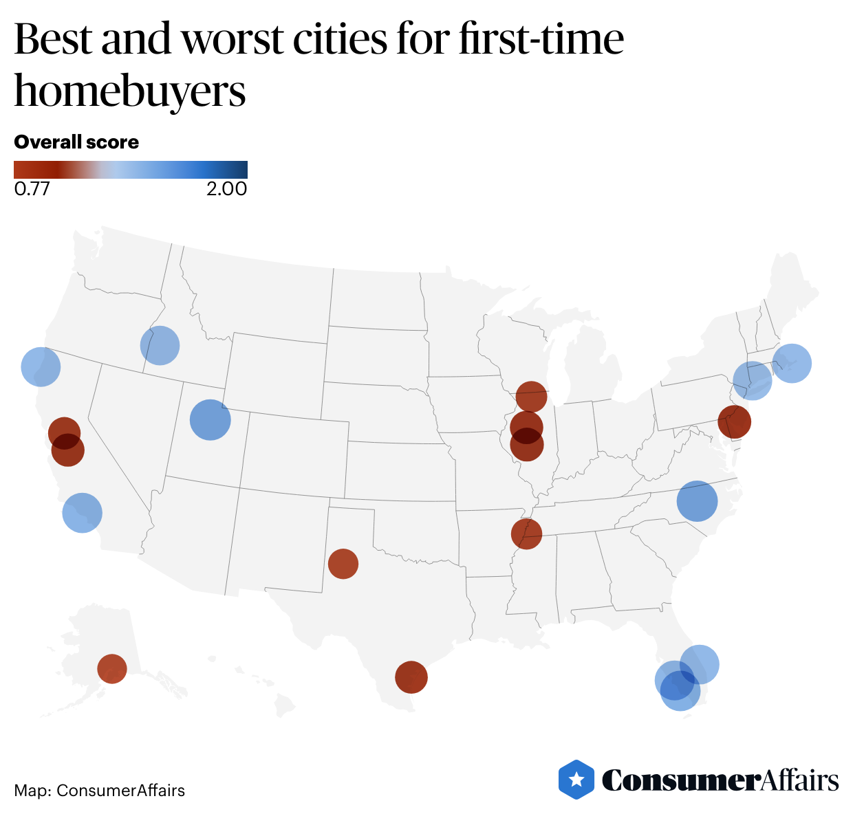 ConsumerAffairs compared metros across nine financial and quality-of-life factors, giving each a financial friendliness score (how expensive it is to buy a home from mortgage rates to home prices and property taxes) and a quality-of-life score that looks at crime rates, unemployment, climate and racial diversity.