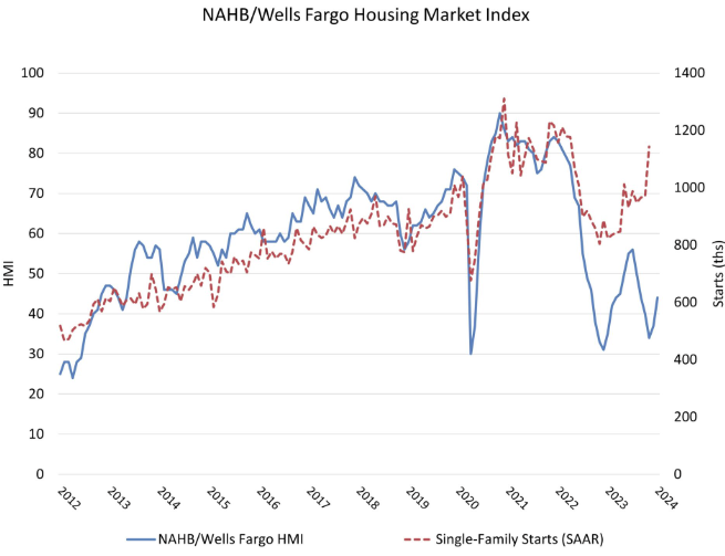 Specifically, the NAHB/Wells Fargo Housing Market Index (HMI) rose seven points to 44, its second monthly increase in a row. Any number over 50 indicates that more builders view conditions as “good,” rather than “poor.”