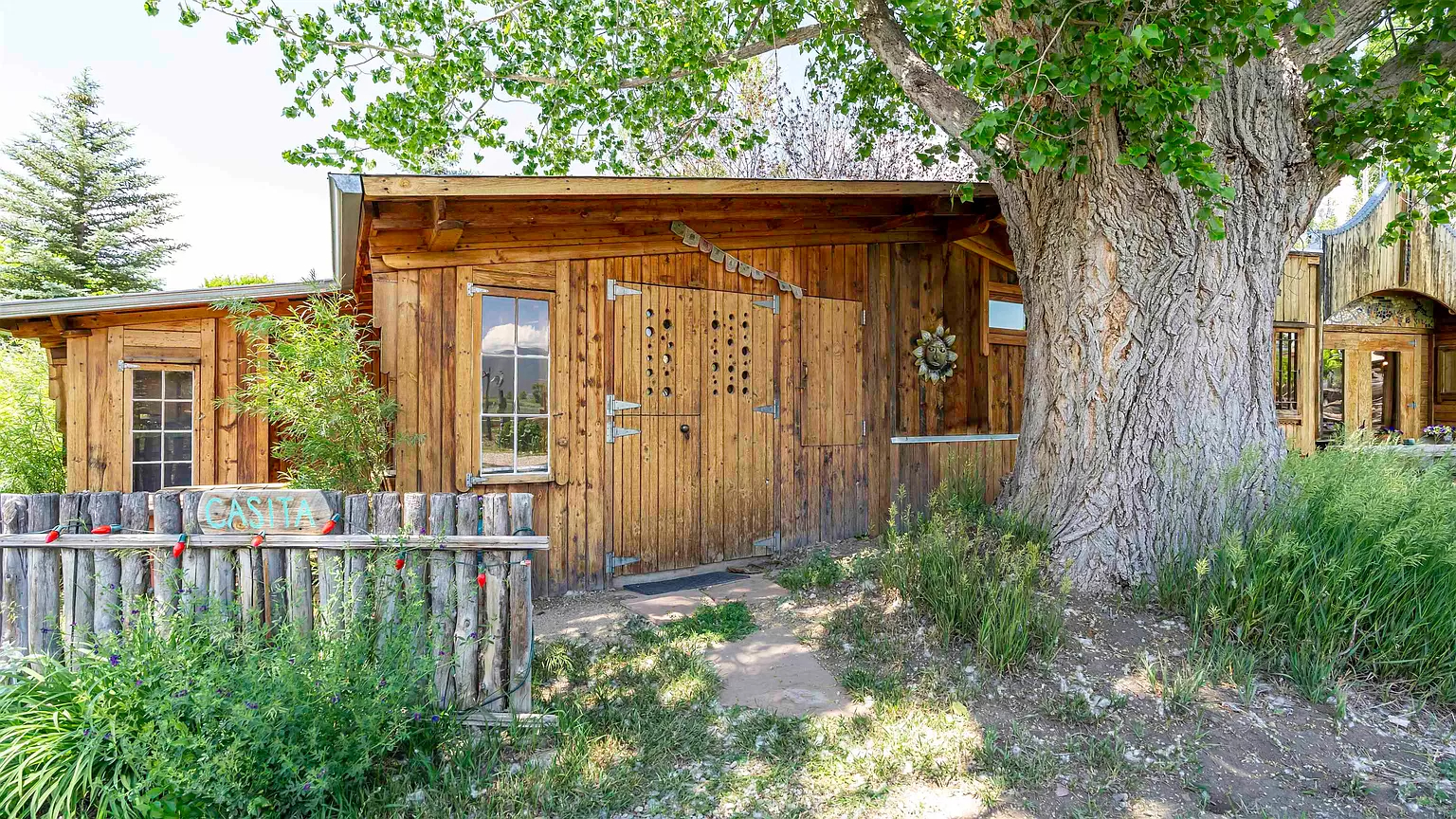 The eight-bedroom, four-bathroom property includes the eclectic main home as well as an acequia, chicken coop, gardens, access to the Rio Fernando and a group of casitas, currently used for short-term rentals.