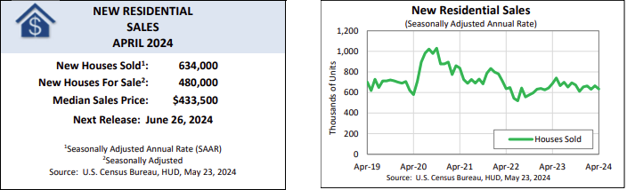 The median price of a new home sold during the month fell to $433,500 from $439,500 in March. Year over year, the median price was up from $417,200 in April 2023.