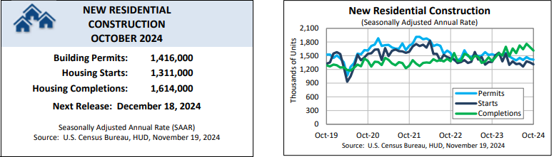 Single-family housing completions were down 1.4% month over month and 0.2% year over year, at a rate of 986,000, while permits for single-family construction were up 0.5% from September but down 1.8% from October 2023.