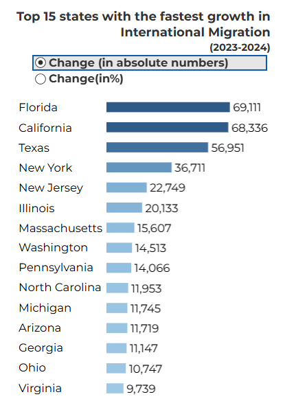 Over 15,600 international migrants moved to the Bay State in 2024, meaning Massachusetts welcomed the seventh-largest number of international migrants in the nation.