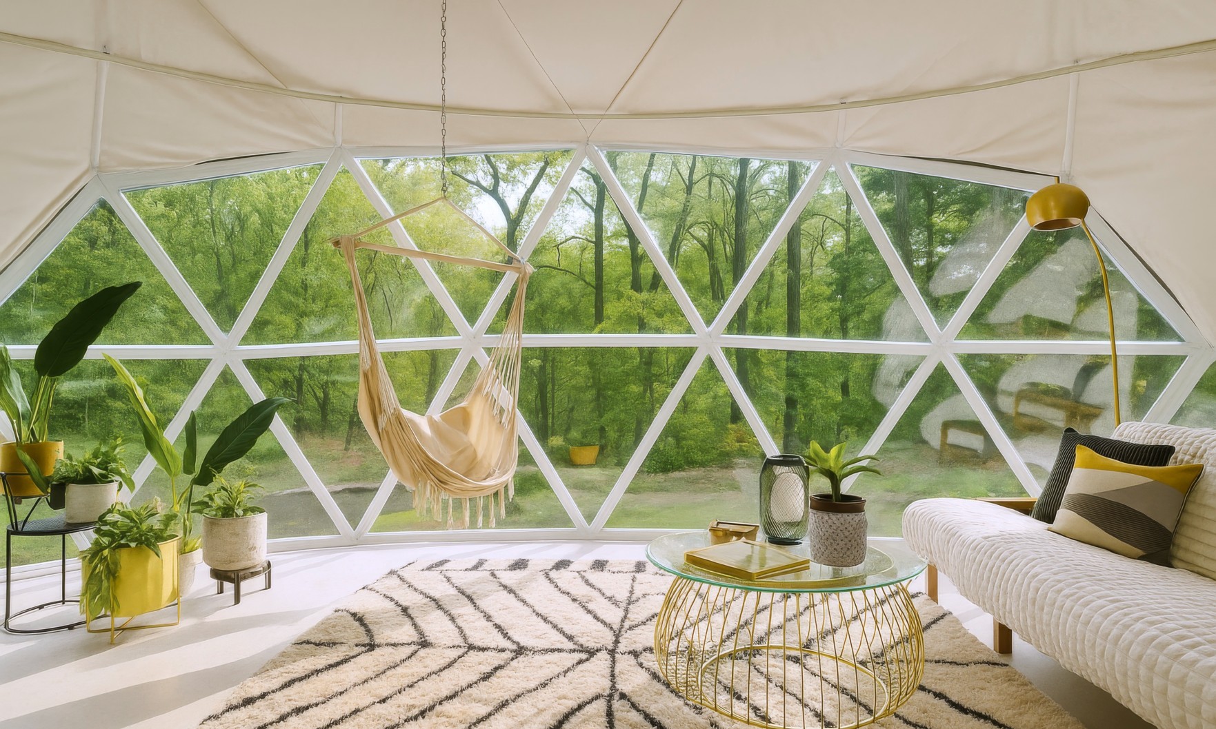 Structured from a network of glass triangles, this hemispheric home is hidden in the woods of Dover Plains, New York, about two hours from the city.