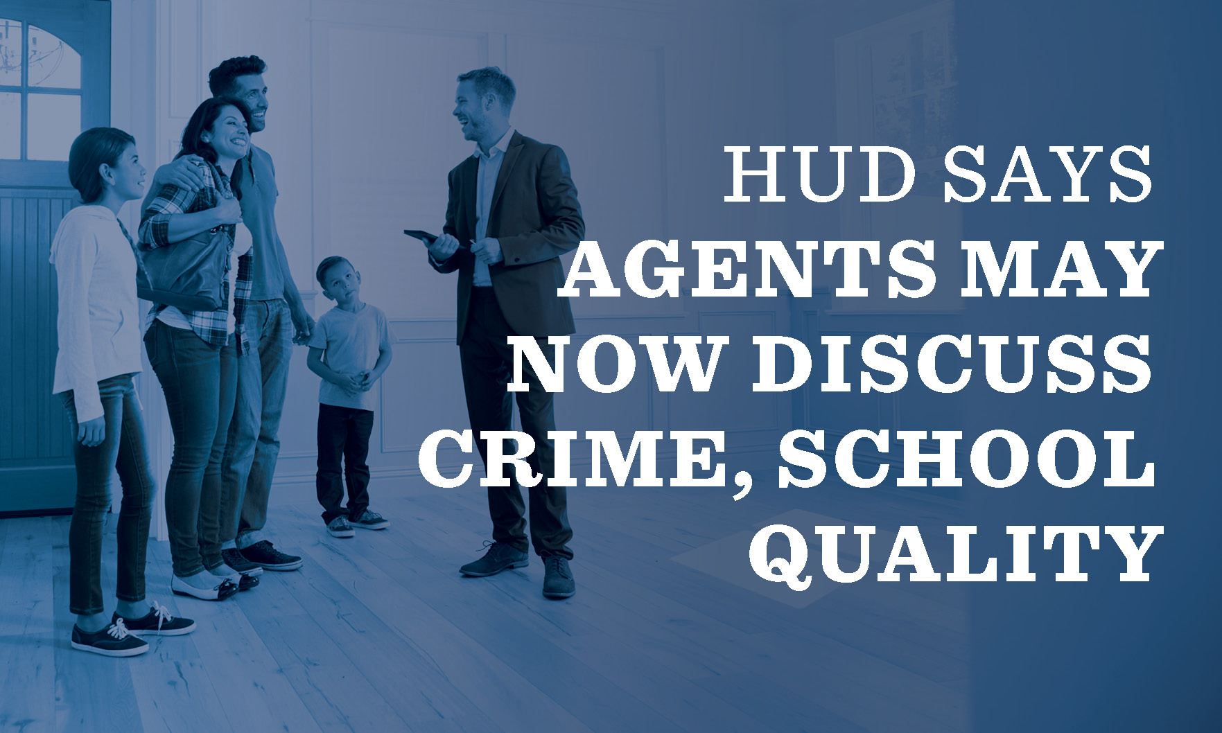 “Contrary to publicly available materials from industry leaders on steering, real estate agents and brokers do not violate the Fair Housing Act merely by discussing with prospective homebuyers or renters the prevalence of crime or the quality of schools in neighborhoods,” HUD Assistant Secretary for Fair Housing and Equal Opportunity Craig Trainor wrote in a “Dear Colleague letter to real estate agents.