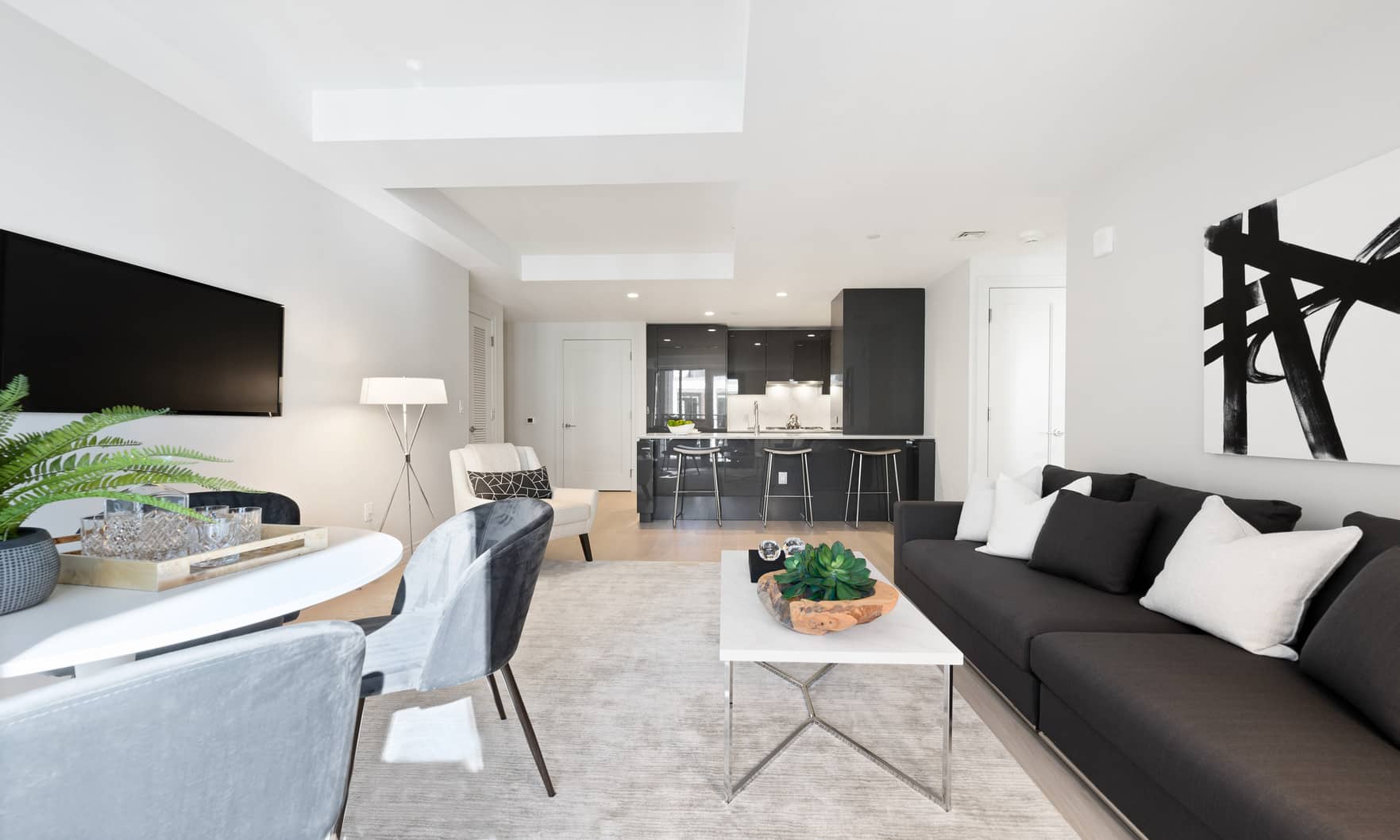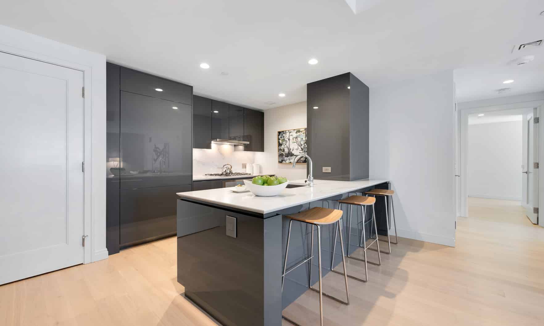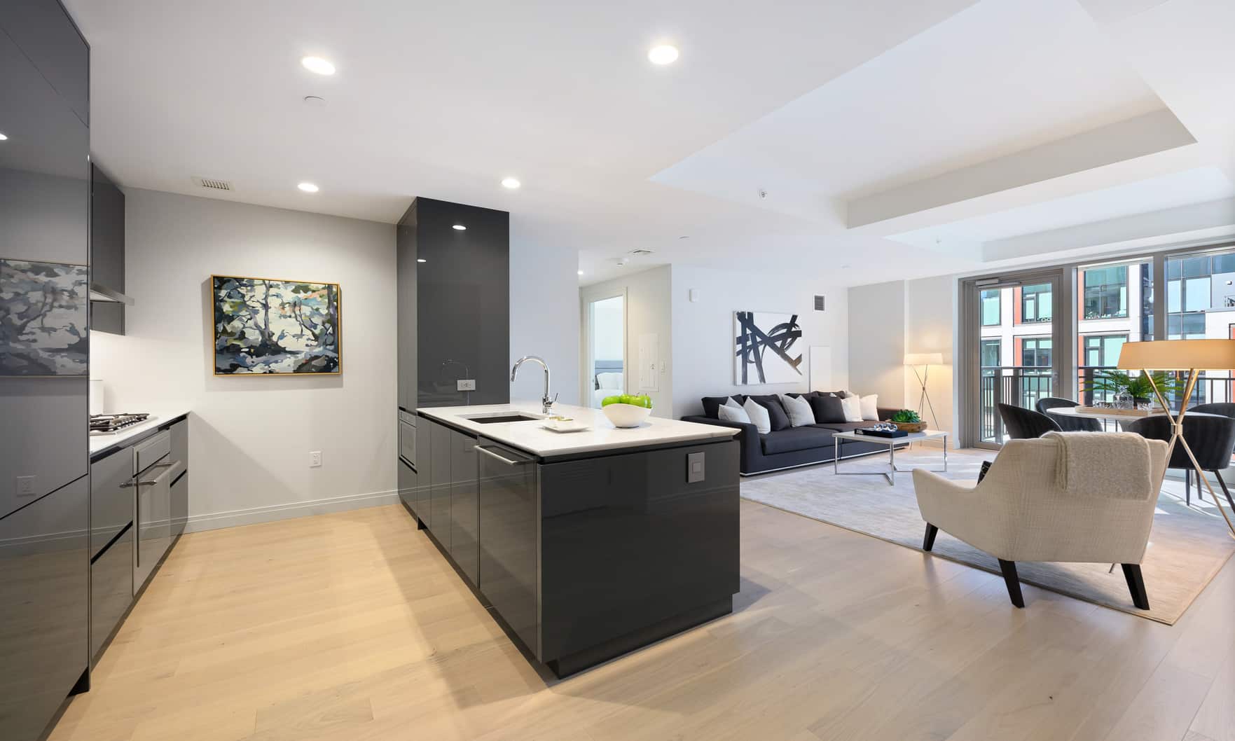 This southwest facing home has floor-to-ceiling windows with a private Balcony overlooking the Grand Pool. The open-concept kitchen with Caesarstone pairs beautifully with dramatic dark grey custom artisan Italian cabinets. Thermador integrated appliances and white oak flooring throughout, this unit is ready for your personal touches! Enjoy luxury resort-style living in Boston’s most exciting neighborhood!