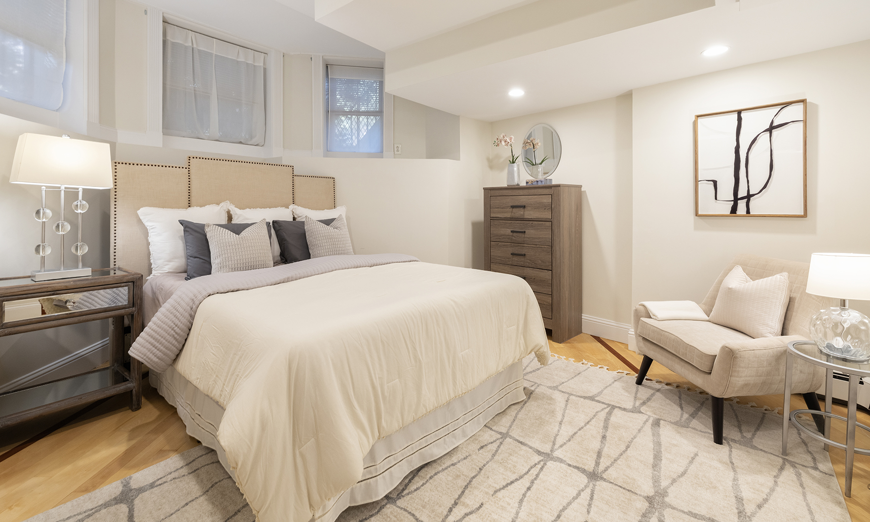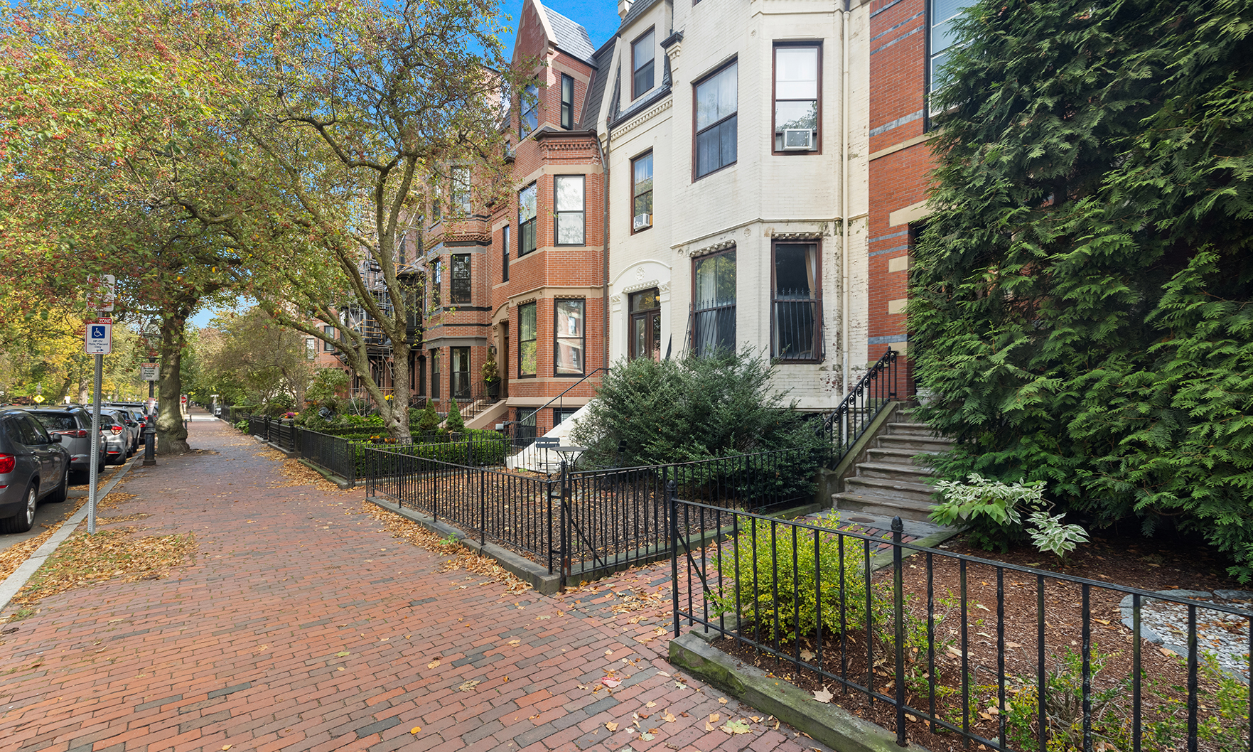 Gorgeous, sunny, modern garden-level condo with private entrance in elevator building on one of the most picturesque streets in Boston.With over 1,200 square feet, two bedrooms and two full baths, this spacious home features an open living and dining area, high ceilings, maple floors with accent inlay, crown moldings, a brick fireplace, and a modern kitchen with new stainless steel appliances, granite counters, and a vent hood. Both bedrooms have tiled bathrooms and large closets. The ample primary suite also has an in-unit washer and dryer.