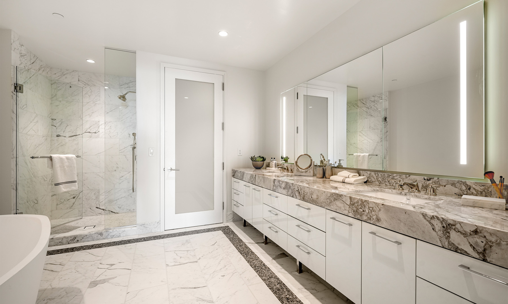 Climate-conscious appliances, including the Wolf induction cooktop and Sub-Zero refrigerator. Marble countertop, backsplash, and island. This kitchen is where a low-carbon lifestyle meets stunning craftsmanship. The spa-like bathrooms feature Italian marble floors and accent tile and Studio Becker cabinetry.